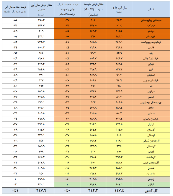 همچنین ارتفاع کل ریزشهای جوی کشور معادل ۱۴۷.۴ میلیمتر است. این مقدار بارندگی نسبت به میانگین دورههای مشابه درازمدت (۲۴۲.۲ میلیمتر) ۴۰ درصد کاهش و نسبت به دوره مشابه سال آبی گذشته (۲۴۷.۶ میلیمتر) ۴۱ درصد کاهش را نشان میدهد.