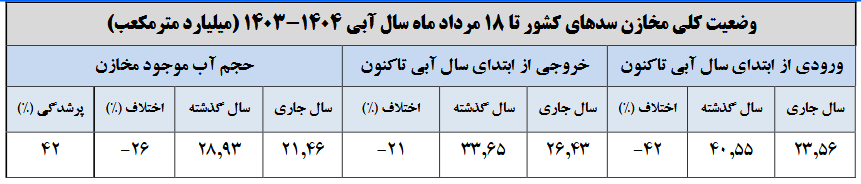 حجم آب موجود مخازن اکنون ۲۱.۴۶ میلیارد متر مکعب ثبت شده که این عدد نسبت به سال قبل که عددی معادل ۲۸.۹۳ میلیارد متر مکعب بوده ۲۶ درصد کاهش یافته است. همچنین حجم پرشدگی سدهای کشور نیز تا این تاریخ ۴۲ درصد است.