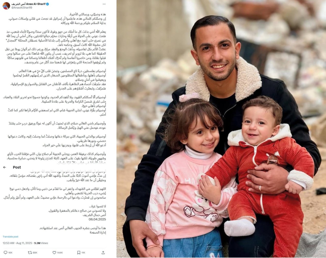 متن وصیتنامه خبرنگار شهید شبکه الجزیره در شبکه اکس با بازدید 9 میلیونی