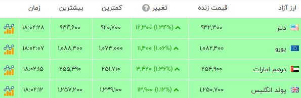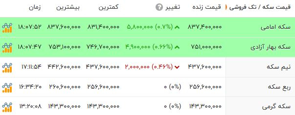 در بازار، نرخ هر گرم طلای 18 عیار با 13 هزار تومان افزایش و با نرخ هفت میلیون و 505 هزار تومان معامله شد. سکه امامی با 580 هزار تومان افزایش، 83 میلیون و 740 هزار تومان و سکه بهار آزادی با 490 هزار تومان افزایش به 75 میلیون و 100 هزار تومان رسید. نرخ نیمسکه و ربع سکه نیز به ترتیب، 43 میلیون و 760 هزار تومان و 25 میلیون و 660 هزار تومان در تابلو اعلان قیمتها نمایان شد که هر دو از نرخ صبح خود کمتر هستند.