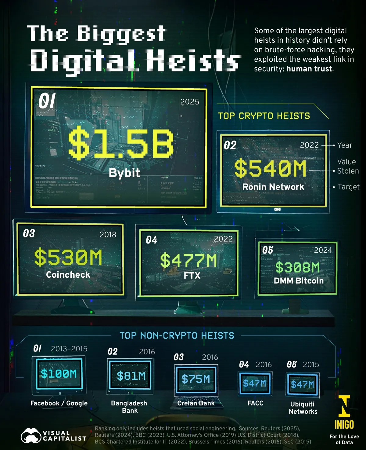 تصویر پایین نشاندهنده ۱۰ سرقت دیجیتال بزرگ جهان و تاکیدکننده بر اهمیت امنیت در فضای دیجیتال و لزوم نظارت بیشتر بر سیستمهای غیرمتمرکز است. پنج تا از این سرقتهای دیجیتال مربوط به دنیای کریپتو و پنج عدد دیگر سرقتهای غیرکریپتویی هستند.