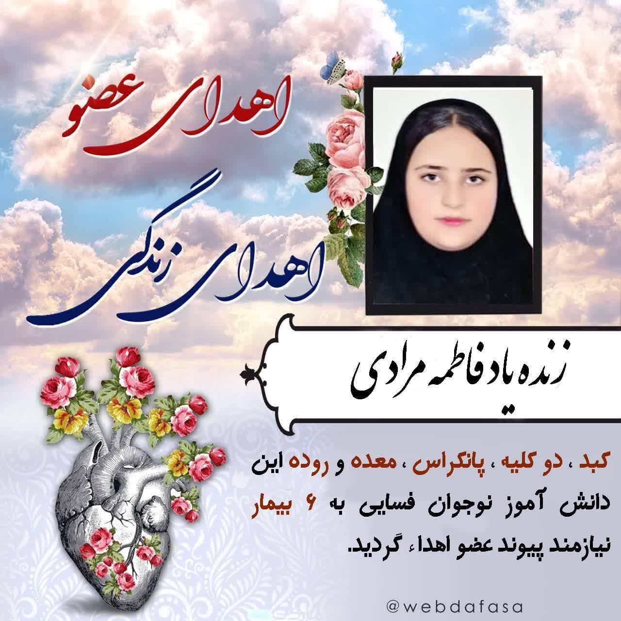 راضیه آسوده، مسئول هماهنگی اهدای عضو دانشگاه علوم پزشکی فسا اظهار کرد: با رضایت خانواده شادروان فاطمه مرادی دانشآموز فسایی، اعضای بدن وی که به دلیل بیماری دچار آسیب مغزی شده بود به بیماران نیازمند اهدا شد.