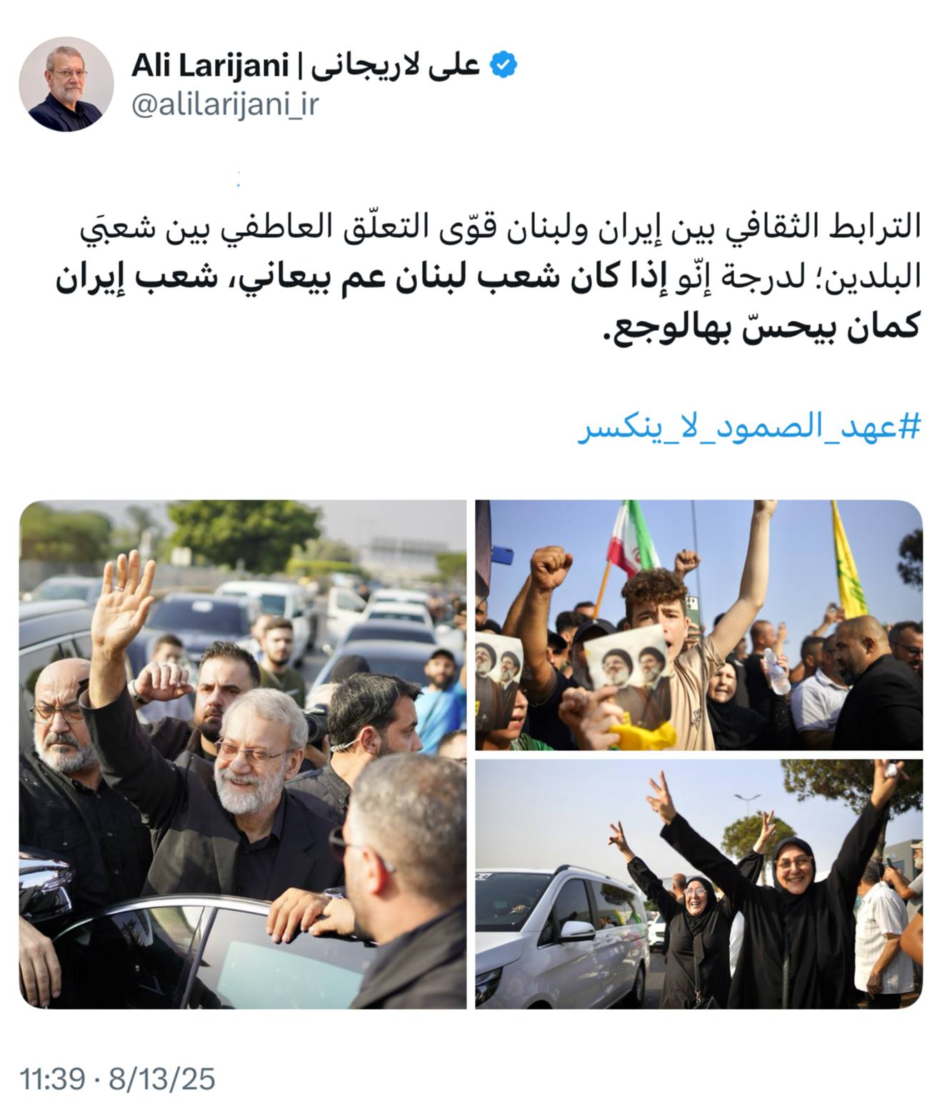 علی لاریجانی توئیتی به زبان عربی نوشت که ترجمه آن به شرح زیر است: