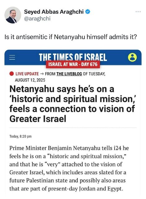 سید عباس عراقچی در مطلبی در شبکه اجتماعی ایکس در این ارتباط با انتشار بخشی از اظهارات نتانیاهو که در مصاحبه با یک شبکه تلویزیونی اسرائیل گفته است که در یک «ماموریت تاریخی و معنوی» به سر میبرد، و علاقه زیادی به دیدگاه «اسرائیل بزرگ» دارد که شامل مناطق متعلق به دولت آینده فلسطین و احیانا بخش های از اردن و مصر می شود. گفت: اگر نتانیاهو خودش اعتراف کند باز هم یهودیستیزی است؟