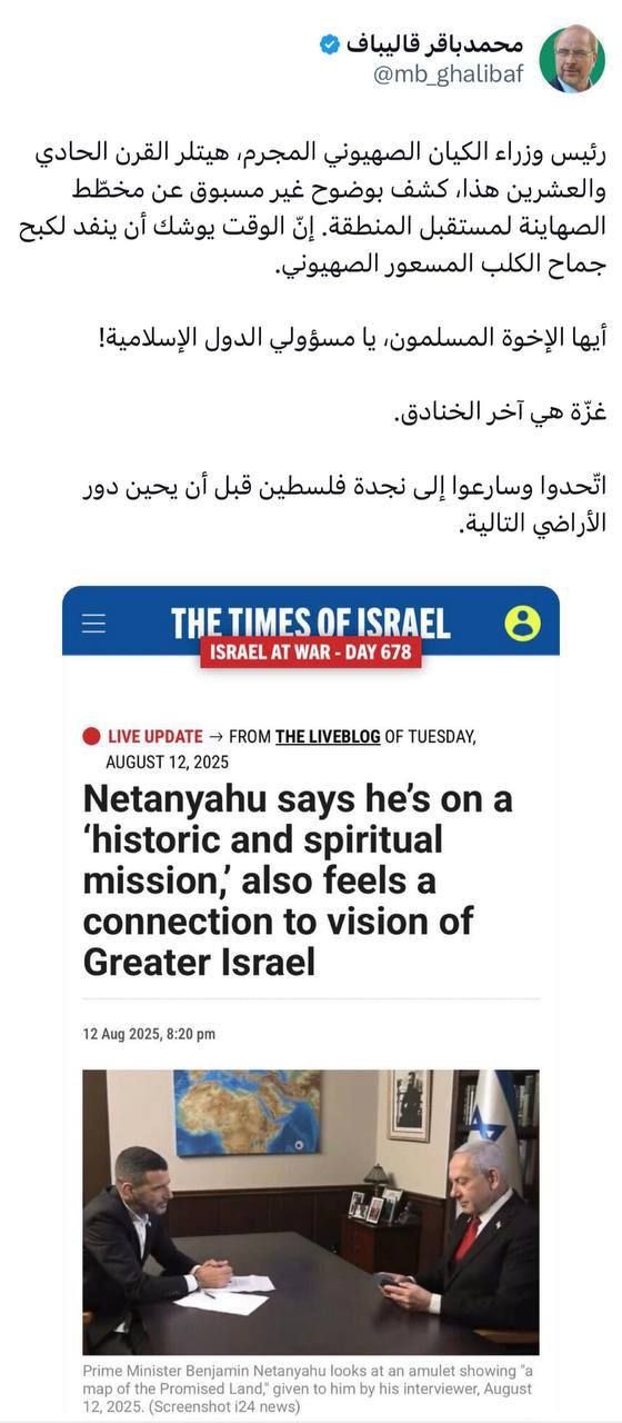 قالیباف: غزه آخرین خاکریز است؛ پیش از آنکه نوبت سرزمینهای بعدی برسد به یاری فلسطین بشتابید