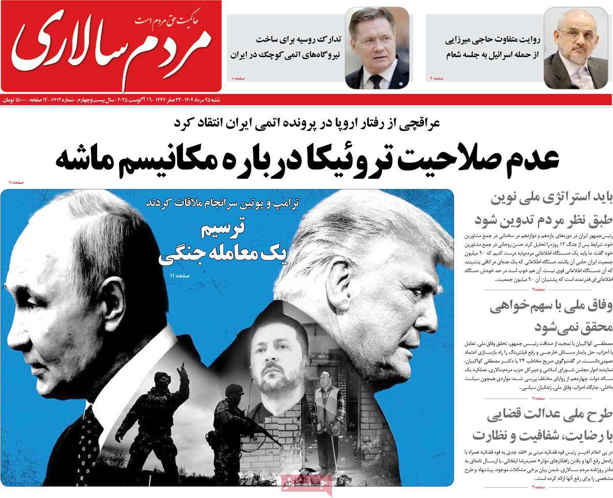 صفحه اول روزنامه مردم سالاری شنبه ۲۵ مرداد