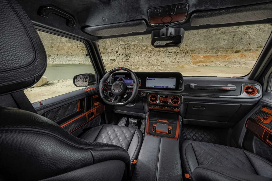 این مرسدس AMG G63 همچنین به محورهای پورتال مجهز شده و برابوس روی شاسی هم اقداماتی جدی انجام داده است. به گفته این تیونر، نرخ نوسان فنرها از داخل کابین قابلتغییر است. شش چرخ ۲۲ اینچی این خودرو با لاستیکهای ۳۲۵/۵۵ زیر گلگیرهای عریض با تزیینات فیبر کربنی قرار گرفتهاند. تزیینات فیبر کربن بیشتری هم در کیت بدنه اختصاصی به کار رفته که این هیولای ششچرخ را متمایزتر میکند. درهای عقب تا ۹۰ درجه باز میشوند تا همراه با پله رکابهای برقی، ورود و خروج رل آسانتر کنند. نورپردازی LED یکپارچه پارکابیها را روشن میکنند و کابین با تریم قرمز تزئین شده است. داخل که فضایی برای پنج سرنشین وجود دارد، با تودوزی چرمی مشکی پوشیده شده و تزئینات فیبر کربنی براق نیز در کابین به کار رفته است.