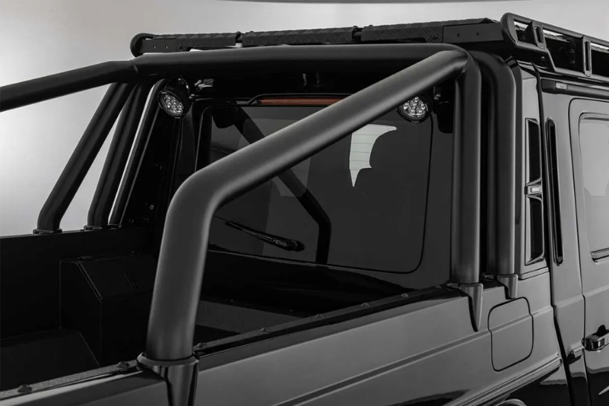 برابوس با سابقه طولانی در تیونینگ نسلهای مختلف مرسدس G کلاس، بار دیگر سراغ این شاسیبلند لوکس نمادین رفته و آن را به برابوس XLP 800 6x6 ادونچر تبدیل کرده است؛ یک هیولای ششچرخ محرک! این تیونر معروف یک شاسی فولادی عظیم برای G کلاس طراحی کرده تا بدنه پیکاپ با طول ۶,۲۳۰ میلیمتر روی آن قرار گیرد. فاصله از زمین ۴۷۰ میلیمتری و افزایش ۱,۵۳۰ میلیمتری فاصله محوری هم از دیگر ویژگیهای این G کلاس ششچرخ است. دیواره پشتی جدیدی پشت صندلیهای عقب نصب شده و کف بار با پانلهای نرم چوب ساج پوشیده شده است. یک پله برقی برای دسترسی آسانتر به اتاق بار و یک رول بار دوگانه مجهز به دو چراغ LED قوی نیز تعبیه شده است.