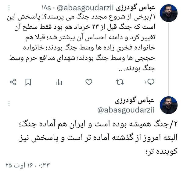 عباس گودرزی نماینده بروجرد در مجلس شورای اسلامی، در صفحه شخصی خود در شبکه اجتماعی ایکس نوشت: برخی از شروع مجدد جنگ میپرسند؟! پاسخش این است که جنگ قبل از ۲۳ خرداد هم بود فقط سطح آن تغییر کرد و دامنه احساس آن بیشتر شد؛ قبلاً هم خانواده فخریزاده ها وسط جنگ بودند؛ خانواده حججیها وسط جنگ بودند؛ شهدای مدافع حرم وسط جنگ بودند.