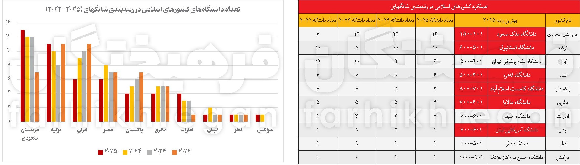 نگاهی جزئیتر به وضعیت کشورهای همسایه حکایت از آن دارد که شرایط دانشگاههای ایران هنوز هم در سراشیبی به سر میبرد. در یک نگاه کلی 10 کشور اسلامی در کل رتبهبندی امسال قرار دارند که بهجز ایران، امارات، قطر و مراکش، بقیه از حیث بهترین دانشگاه تنزل را تجربه کردند؛ با این حال دانشگاه ملک سعود کماکان دانشگاه اول منطقه و عربستان است. البته آنها از جمع 100 دانشگاه نخست خارج شدند و امسال در جایگاه 101-105 جای گرفتند. از حیث تعداد رشد دانشگاههای عربستانی در این رتبهبندی کماکان ادامه دارد و از سال 2022 تقریبا تعداد دانشگاههایشان دو برابر شد. ترکیه دیگر رقیب علمی ایران امسال 11 دانشگاه در جمع هزار دانشگاه برتر دارد. سیر نزولی تعداد دانشگاههای ایرانی از 2020 هم کماکان ادامه دارد و به نصف تقلیل یافته است. امسال فقط 6 دانشگاه ایرانی موفق به حضور در ردهبندی شانگهای شدند؛ در بین این 6 دانشگاه نیز تهران و علوم پزشکی تهران، جایگاه قبلی خود را حفظ کردند اما تربیت مدرس، علوم پزشکی شهید بهشتی، صنعتی شریف و علوم پزشکی ایران همگی افت را تجربه کردند.