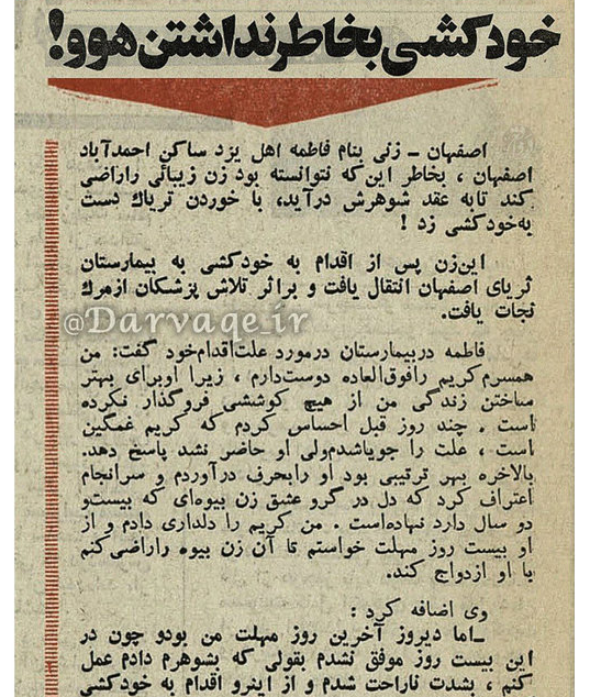 من برای آرام کردن کریم، بیست روز مهلت خواستم تا آن زن را راضی کنم به عقد او درآید. اما دیروز آخرین روز مهلت بود و چون در این مدت موفق نشدم به قولی که به شوهرم داده بودم عمل کنم، به شدت ناراحت شدم و از این رو اقدام به خودکشی کردم.»