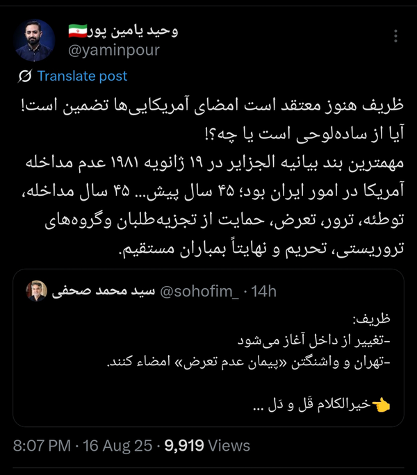 وحید یامینپور در شبکه اجتماعی ایکس نوشت: ظریف هنوز معتقد است امضای آمریکاییها تضمین است! آیا از سادهلوحی است یا چه؟! مهمترین بند بیانیه الجزایر در ۱۹ ژانویه ۱۹۸۱ عدم مداخله آمریکا در امور ایران بود؛ ۴۵ سال پیش... ۴۵ سال مداخله، توطئه، ترور، تعرض، حمایت از تجزیهطلبان وگروههای تروریستی، تحریم و نهایتاً بمباران مستقیم.
