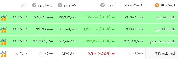 در بازار، هر گرم طلای 18 عیار با 97 هزار تومان افزایش و با نرخ هفت میلیون و 498 هزار تومان معامله شد. سکه امامی با 330 هزار تومان افزایش، 83 میلیون و 660 هزار تومان و سکه بهار آزادی با 730 هزار تومان افزایش، 75 میلیون و 300 هزار تومان قیمتگذاری شدند.