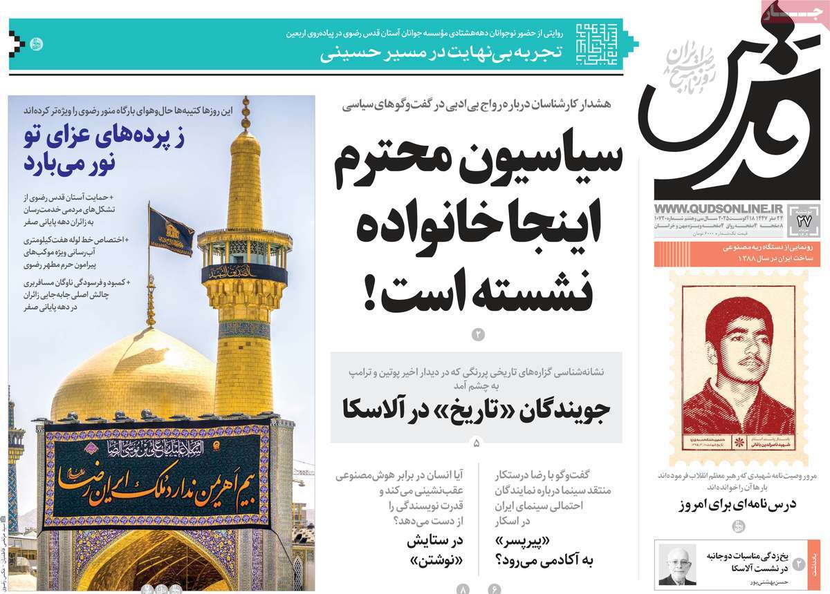 صفحه اول روزنامه قدس دوشنبه ۲۷ مرداد