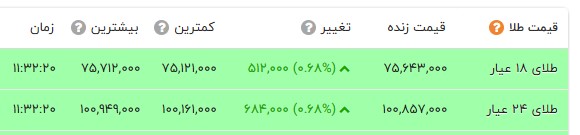 در بازار نرخ هر گرم طلای 18 عیار با 51 هزار تومان افزایش و با نرخ هفت میلیون و 564 هزار تومان در بازار طلا معامله شد. سکه امامی با 690 هزار تومان افزایش به 84 میلیون و 185 هزار تومان قیمت گذاری شد. سکه بهار آزادی با 880 هزار تومان افزایش به 76 میلیون و 90 هزار تومان رسید. نرخ نیم سکه و ربع سکه به ترتیب 43 میلیون و 900 هزار تومان و 25 میلیون و 900 هزار تومان در تابلو اعلان قیمتها نمایان شد.