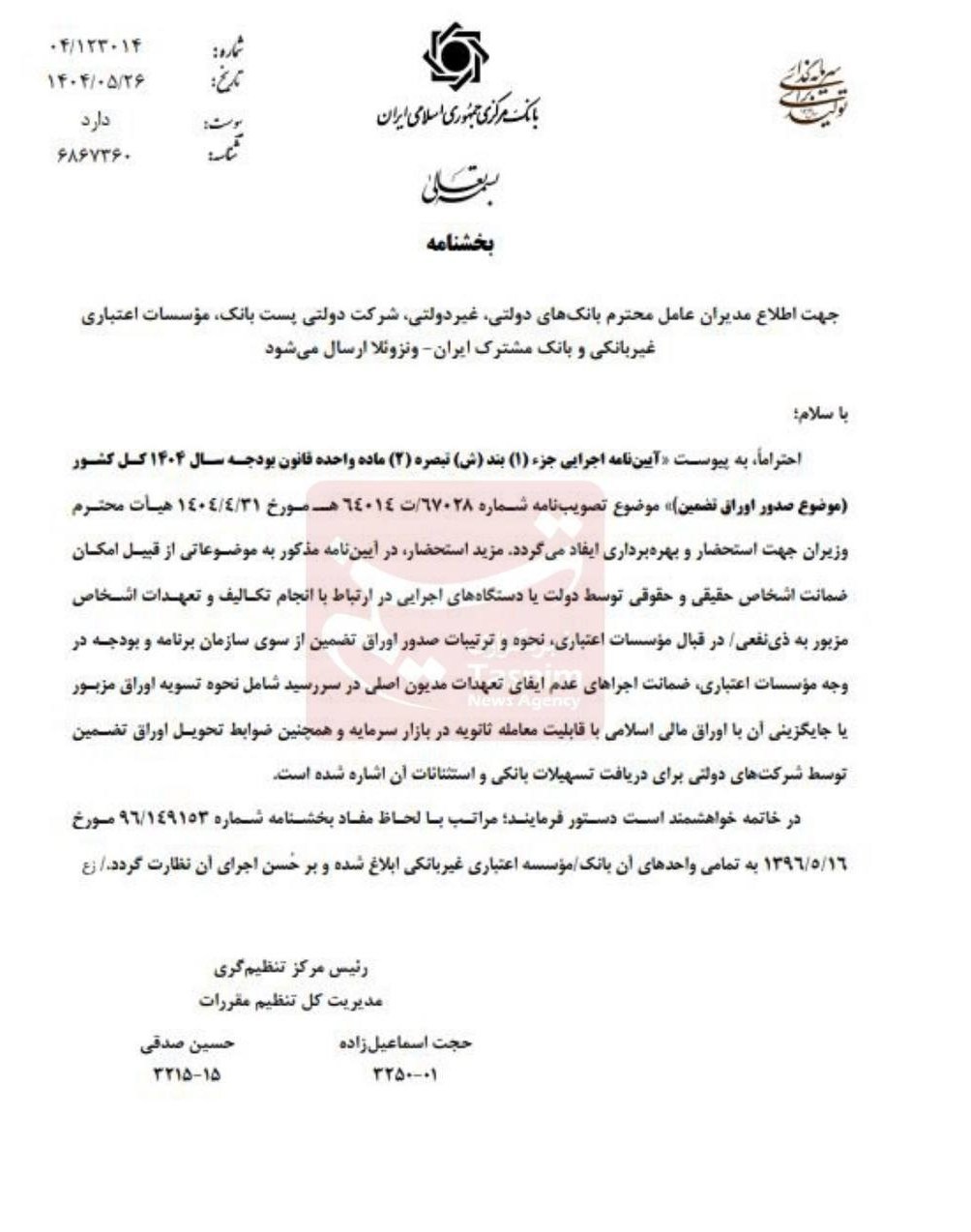 بانک مرکزی طی بخشنامهای به شماره 04/123014 مورخ 26 مرداد 1404، آییننامه اجرایی جزء (1) بند (ش) تبصره (2) ماده واحده قانون بودجه سال 1404 را به کلیه بانکهای دولتی، غیردولتی، پست بانک، مؤسسات اعتباری غیربانکی و بانک مشترک ایران–ونزوئلا ابلاغ کرد. این آییننامه در حقیقت چراغ سبز دولت و سازمان برنامه و بودجه برای صدور اوراق تضمین بهمنظور پشتیبانی از تعهدات اشخاص حقیقی و حقوقی در قبال مؤسسات اعتباری است.