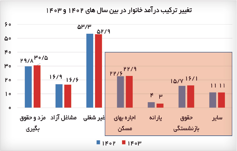 جزئیات دیگری از درآمد خانوارهای شهری نیز نکات مثبت و منفی دارد. سهم درآمدهای غیرشغلی از کل درآمد خانوار در سال ۱۴۰۳ کاهش یافته و از ۵۳.۳ درصد به ۵۲.۹ درصد رسیده است؛ نشانهای از اتکا کمتر به درآمدهای غیرمولد. همزمان، کاهش درآمدهای مشاغل آزاد موجب شد سهم درآمدهای مزد و حقوقبگیری افزایش یابد. در بین درآمدهای غیرشغلی، سهم اجارهبهای مسکن رشد کرده است، نشاندهنده آن که همچنان این بخش یکی از نقاط اتکای خانوارها در دوران رشد اقتصادی پایین و کاهش درآمد مشاغل است.