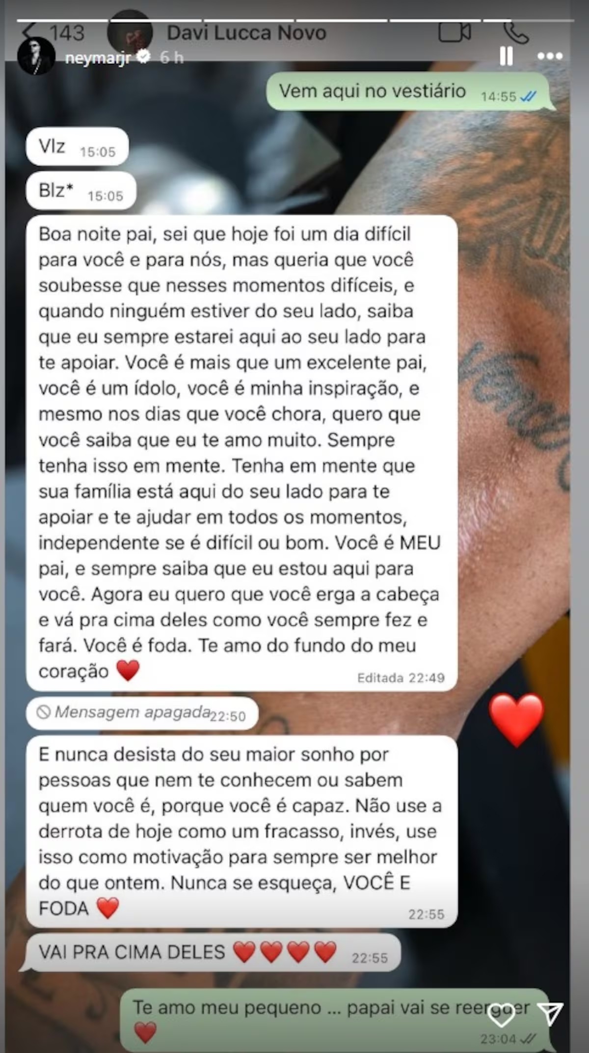 نیمار در پاسخ به این پیام در واتساپ نوشت: «دوستت دارم، کوچولوی من. بابا دوباره برمیخیزد.»