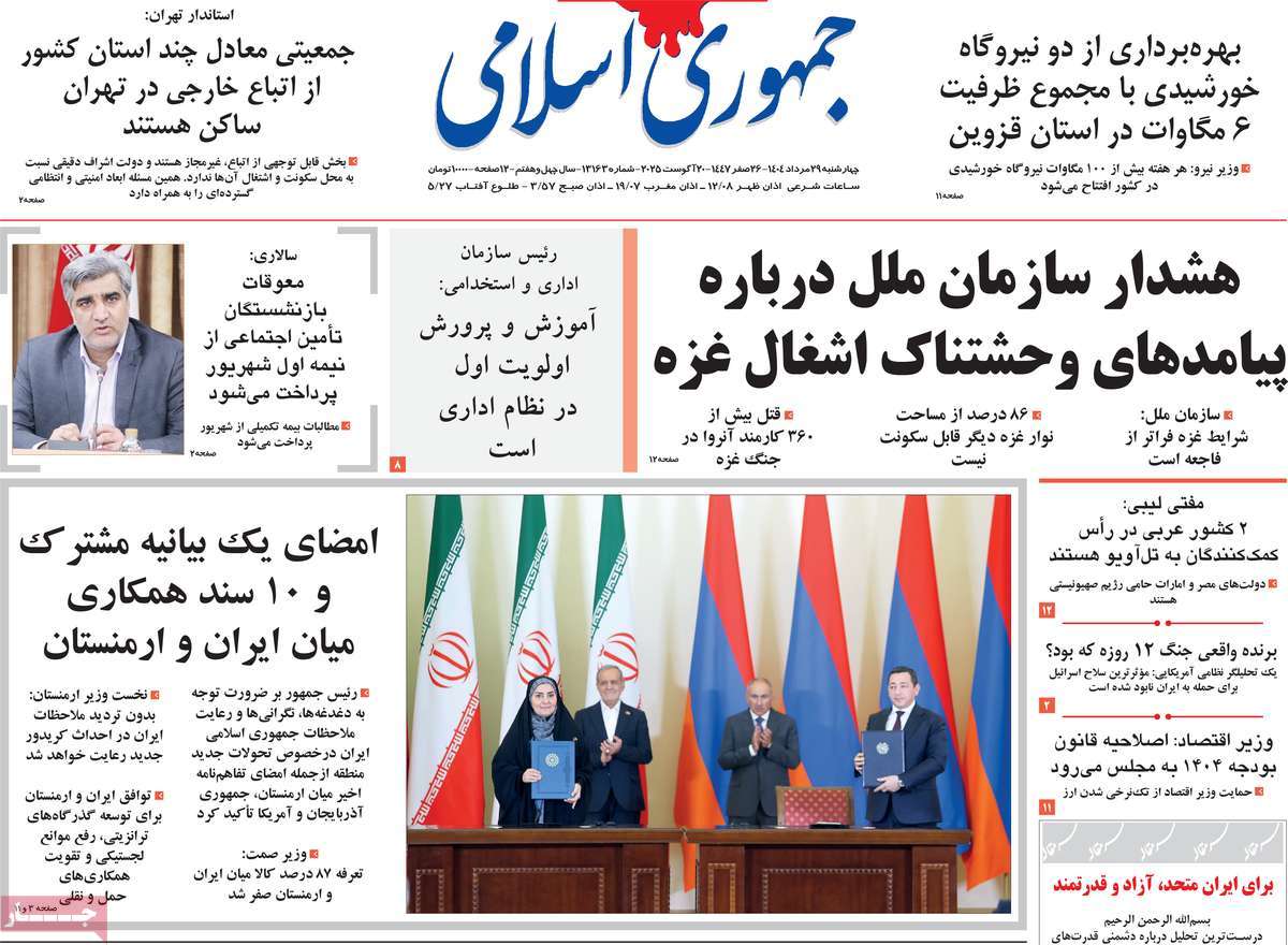 صفحه اول روزنامه جمهوری اسلامی چهارشنبه ۲۹ مرداد