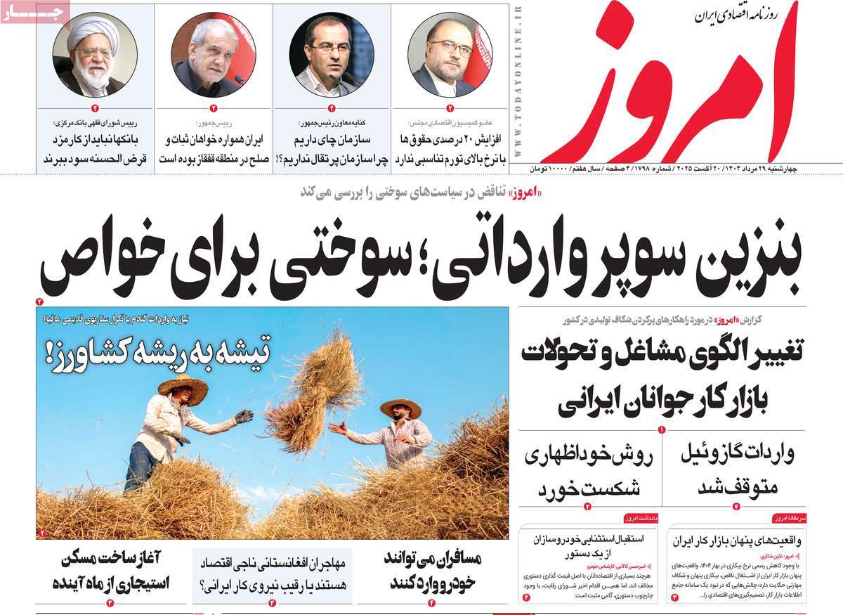 صفحه اول روزنامه امروز چهارشنبه ۲۹ مرداد