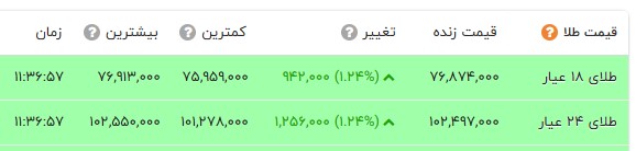 در بازار نرخ هر گرم طلای 18 عیار با 94 هزار تومان افزایش و با نرخ هفت میلیون و 687 هزار تومان در بازار طلا معامله شد. سکه امامی با 520 هزار تومان افزایش به 84 میلیون و 510 هزار تومان قیمت گذاری شد. سکه بهار آزادی با 930 هزار تومان افزایش به 76 میلیون و 920 هزار تومان رسید. نرخ نیم سکه و ربع سکه به ترتیب 44 میلیون و 200 هزار تومان و 25 میلیون و 800 هزار تومان در تابلو اعلان قیمتها نمایان شد.