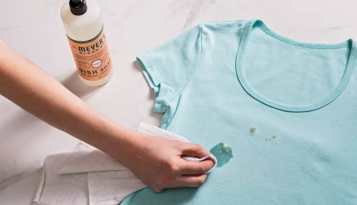 تکه های درشت رو از روی لباس برارید و بعد سرکه، مایع ظرفشویی و آب گرم باهم مخلوط کنین و با یک اسفنج روی لکه بکشین