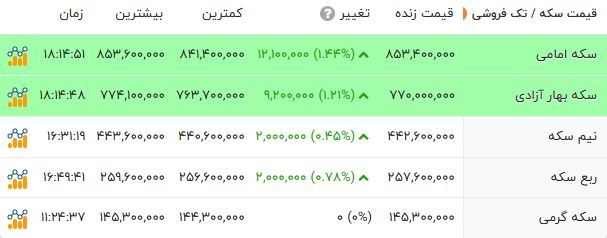 نیمسکه و ربع سکه نیز به ترتیب، 44 میلیون و 260 هزار تومان و 25 میلیون و 760 هزار تومان در تابلو اعلان قیمتها نمایان شدند.