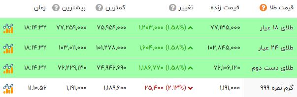 در بازار، هر گرم طلای 18 عیار با 120 هزار تومان افزایش و با نرخ هفت میلیون و 713 هزار تومان معامله شد؛ سکه امامی با یکمیلیون و 210 هزار تومان افزایش، 85 میلیون و 340 هزار تومان و سکه بهار آزادی با 920 هزار تومان افزایش، 77 میلیون تومان قیمتگذاری شدند.