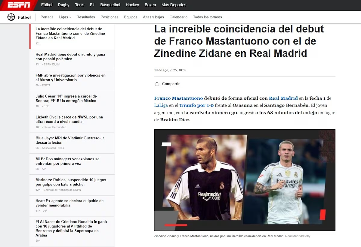 ورزش 3/فرانکو ماستانتونو، استعداد 18 ساله آرژانتینی، در اولین بازیاش برای رئال مادرید مقابل اوساسونا، توجه رسانههای آرژانتینی را جلب کرد.