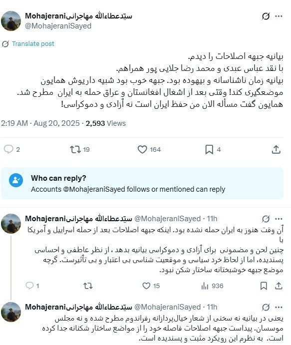 تسنیم/ سید عطاءالله مهاجرانی وزیر اسبق فرهنگ و ارشاد اسلامی، با انتشار یادداشتی در شبکه اجتماعی ایکس بیانیه اخیر جبهه اصلاحات را زمان ناشناسانه و بیهوده دانست.
