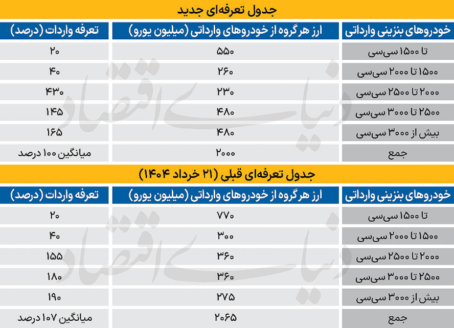 دنیای اقتصاد/ هیات دولت با اصلاح آییننامه واردات خودرو، تعرفه میانگین را از ۱۰۷ به ۱۰۰درصد کاهش داد. در این میان، تعرفه خودروهای بالای ۲۵۰۰سیسی بهطور قابلتوجهی کاهش و بخش بیشتری از ارز تخصیصی نیز به این گروه اختصاص یافته است. این تغییرات بیانگر تمرکز دولت بر افزایش واردات و کاهش حمایت تعرفهای از خودروسازان داخلی است.