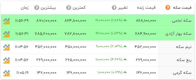 به گزارش آخرین خبر و تا لحظه تنظیم این خبر، سکه امامی با رشد یک میلیون و 600 هزار تومانی قیمت، 86 میلیون و 810 هزار تومان قیمت گذاری شد.