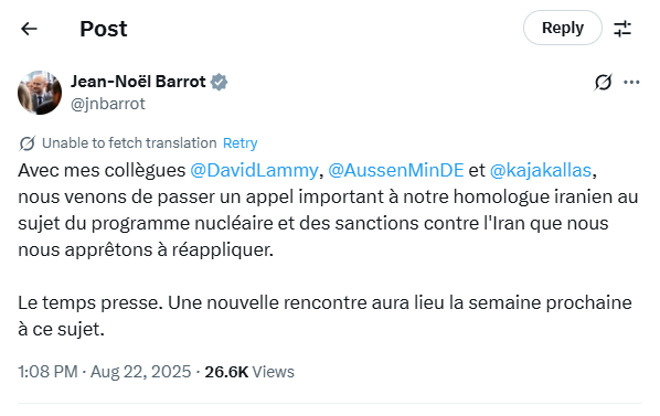 ژان نوئل بارو بعدازظهر امروز و پس از تماس تلفنی وی به همراه دیوید لمی و یوهان وادفول وزرای امور خارجه انگلیس و آلمان و کایا کالاس مسوول سیاست خارجی اتحادیه اروپا با سیدعباس عراقچی وزیر امور خارجه ایران نوشت: لحظاتی پیش تماس مهمی با همتای ایرانی خود درباره برنامه هستهای و تحریمهایی علیه ایران که در شرف اعمال مجدد آن هستیم، داشتیم.