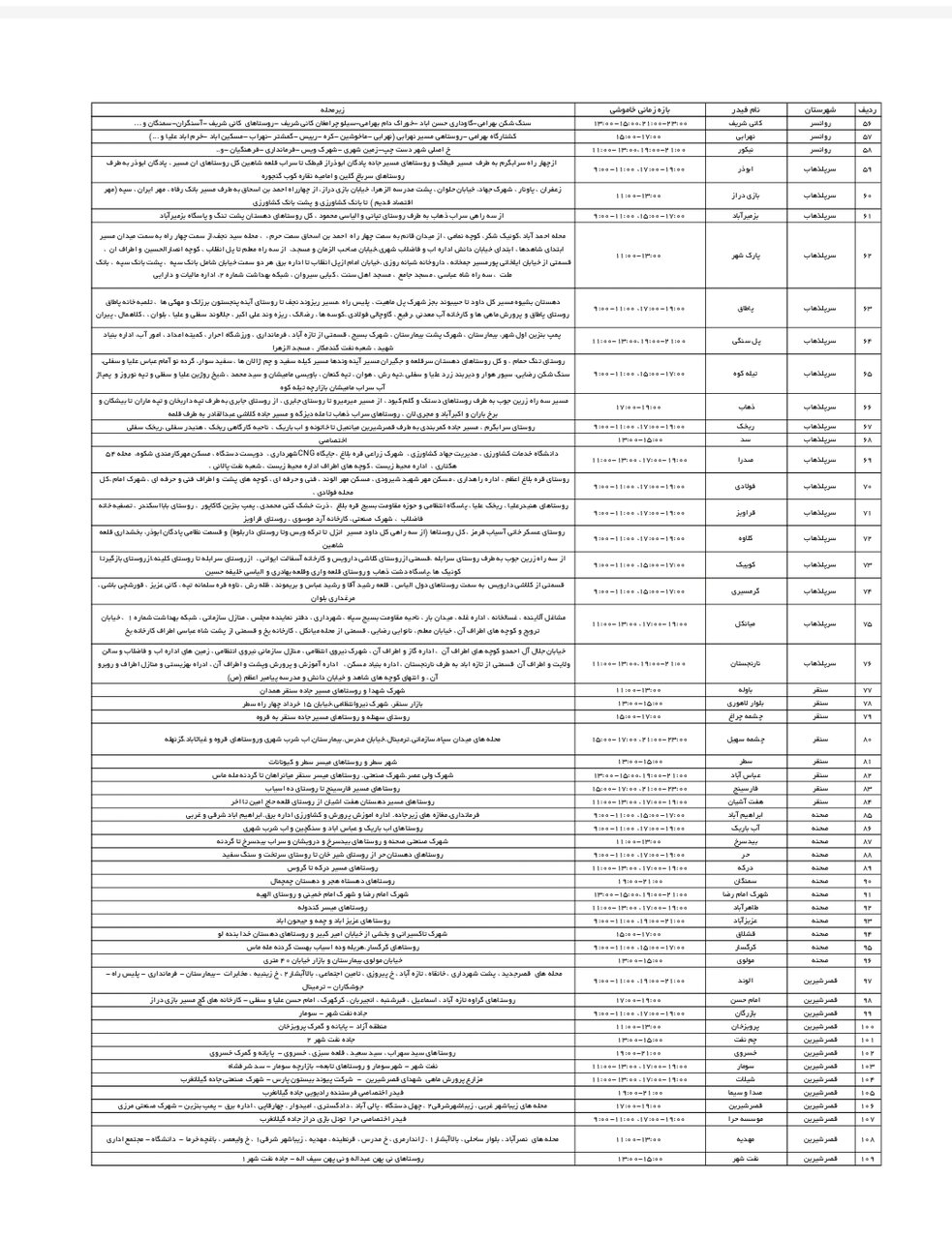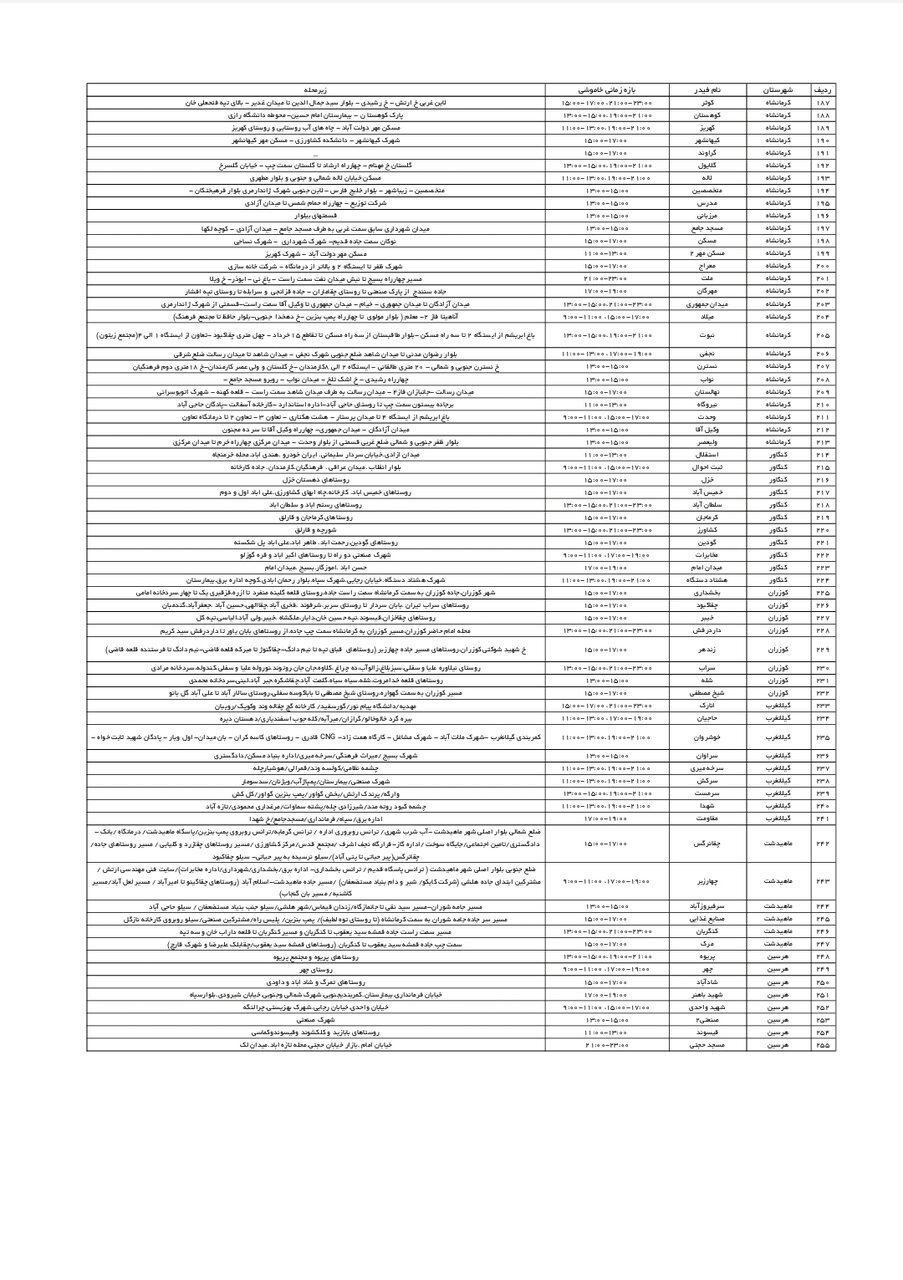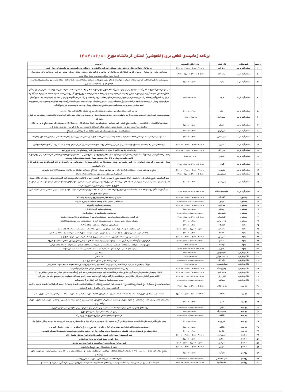 شرکت توزیع برق استان کرمانشاه طی جدولی، زمانبندی قطعی برق در مناطق مختلف استان کرمانشاه را برای امروز _ شنبه اول شهریور_ اعلام کرد.