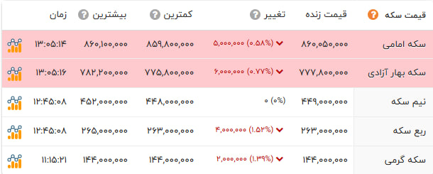 به نقل از سایت شبکه اطلاع رسانی طلا، سکه و ارز امروز 1 شهریور نرخ سکه امامی با 500 هزار تومان کاهش به قیمت 86 میلیون و 5 هزار تومان رسید. سکه تمام بهار آزادی نیز با 600 هزار تومان کاهش، 77 میلیون 780 هزار تومان قیمت گذاری شد. ربع سکه در بازار امروز 400 هزار تومان ریزش داشت و به قیمت 26 میلیون 300 هزار تومان معامله شد.