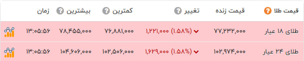 نرخ هر گرم طلا 18 عیار با ریزش 122 هزار 100 تومانی به قیمت 7 میلیون 723 هزار 200 تومان رسیدو همچنین طلای 24 عیار در بازار امروز با کاهش 162 هزار 900 تومانی به بهای 10 میلیون 297 هزار400 تومان معامله شد.