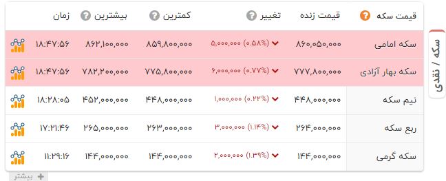 به گزارش آخرین خبر و به نقل از سایت شبکه اطلاعرسانی طلا، سکه و ارز؛ تا لحظه تنظیم این خبر، سکه امامی با کاهش 500 هزار تومانی، 76 میلیون و 50 هزار تومان قیمتگذاری شد، سکه بهار آزادی نیز 600 هزار تومان ریزش کرد و در قیمت 77 میلیون و 80 هزار تومان ثابت ماند. نیم سکه نیز 100 هزار تومان از ارزش خود را از دست داد و 44 میلیون و 80 هزار تومان قیمت گرفت.