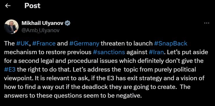 میخائیل اولیانوف، نماینده دائم روسیه در نهادهای بینالمللی مستقر در وین با انتشار پیامی در شبکه اجتماعی ایکس اعلام کرد: انگلیس، فرانسه و آلمان تهدید کردهاند مکانیسم اسنپبک برای بازگرداندن تحریمهای قبلی علیه ایران را راهاندازی میکنند.