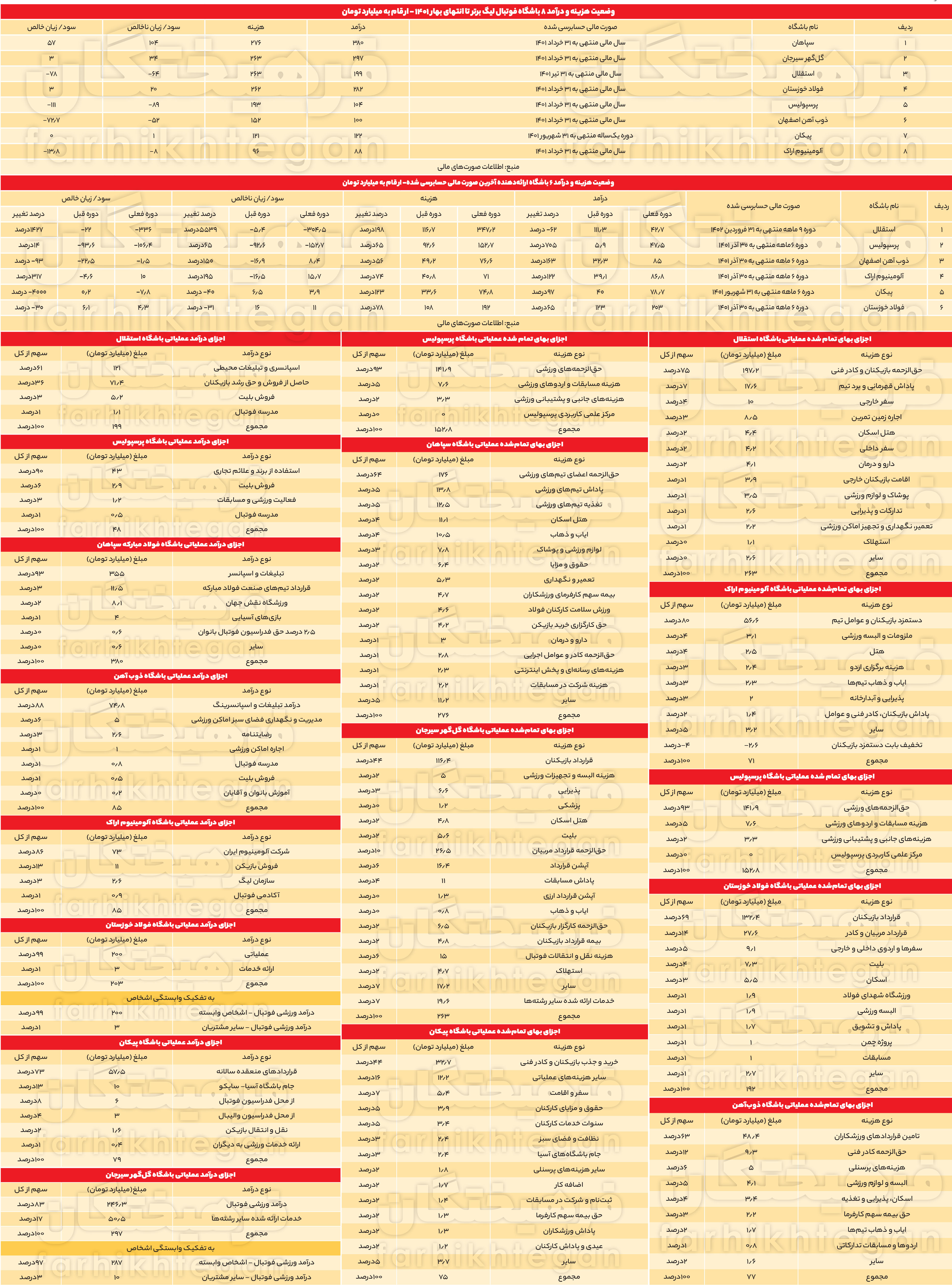 بررسی آخرین صورت مالی حسابرسیشده 8 باشگاه استقلال، پرسپولیس، ذوبآهن اصفهان، آلومینیوم اراک، پیکان، گلگهر سیرجان، سپاهان اصفهان و فولاد خوزستان نشان میدهد که از میان باشگاههای فوقالذکر باشگاههای استقلال و پرسپولیس در بازه زمانی بررسی و در نظر گرفتن درآمد و هزینه عملیاتی بهعنوان اولین و اصلیترین سرفصلهای مالی در عملکرد باشگاهها، با زیان روبهرو بودند و درآمد عملیاتی آنان کفاف هزینههای عملیاتی را نداده است؛ این درحالی است که مشاهده ارقام باشگاههای دیگر نشان میدهد این باشگاهها در بازههای مالی نهتنها ضرر نکردند بلکه درآمد عملیاتی آنان از هزینه عملیاتیشان بیشتر است.