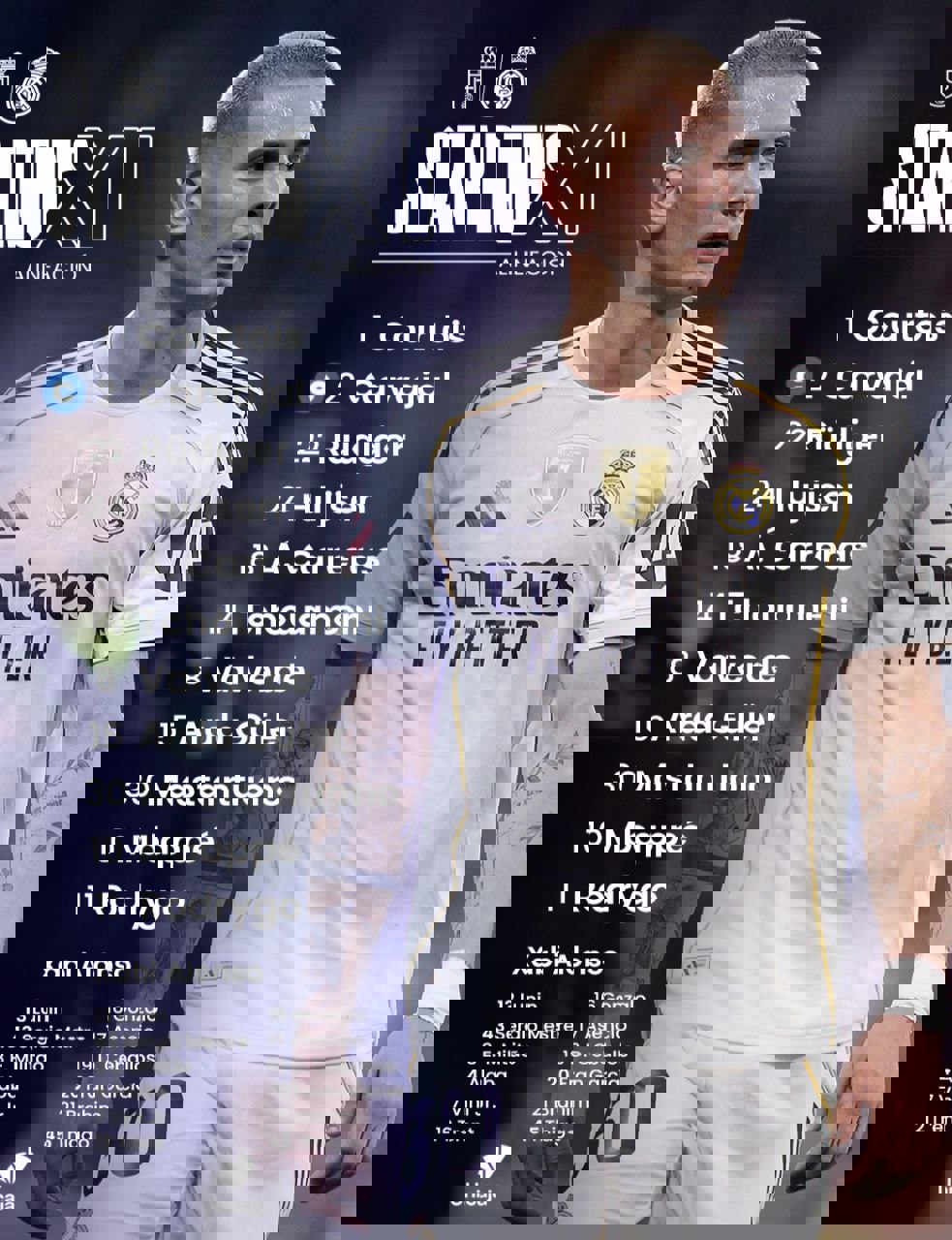 ترکیب اصلی رئال مادرید: کورتوا، کارراس، هویسن، رودیگر، کارواخال، شوامنی، والورده، ماستانتونو، گولر، رودریگو، امباپه