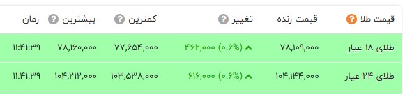 در بازار نرخ هر گرم طلای 18 عیار با 46 هزار تومان افزایش و با نرخ هفت میلیون و 810 هزار تومان در بازار طلا معامله شد. سکه امامی با 270 هزار تومان افزایش به 86 میلیون و 480 هزار تومان قیمت گذاری شد. سکه بهار آزادی با 190 هزار تومان افزایش به 78 میلیون تومان رسید. نرخ نیم سکه و ربع سکه به ترتیب 45 میلیون و 100 هزار تومان و 26 میلیون و 700 هزار تومان در تابلو اعلان قیمتها نمایان شد.