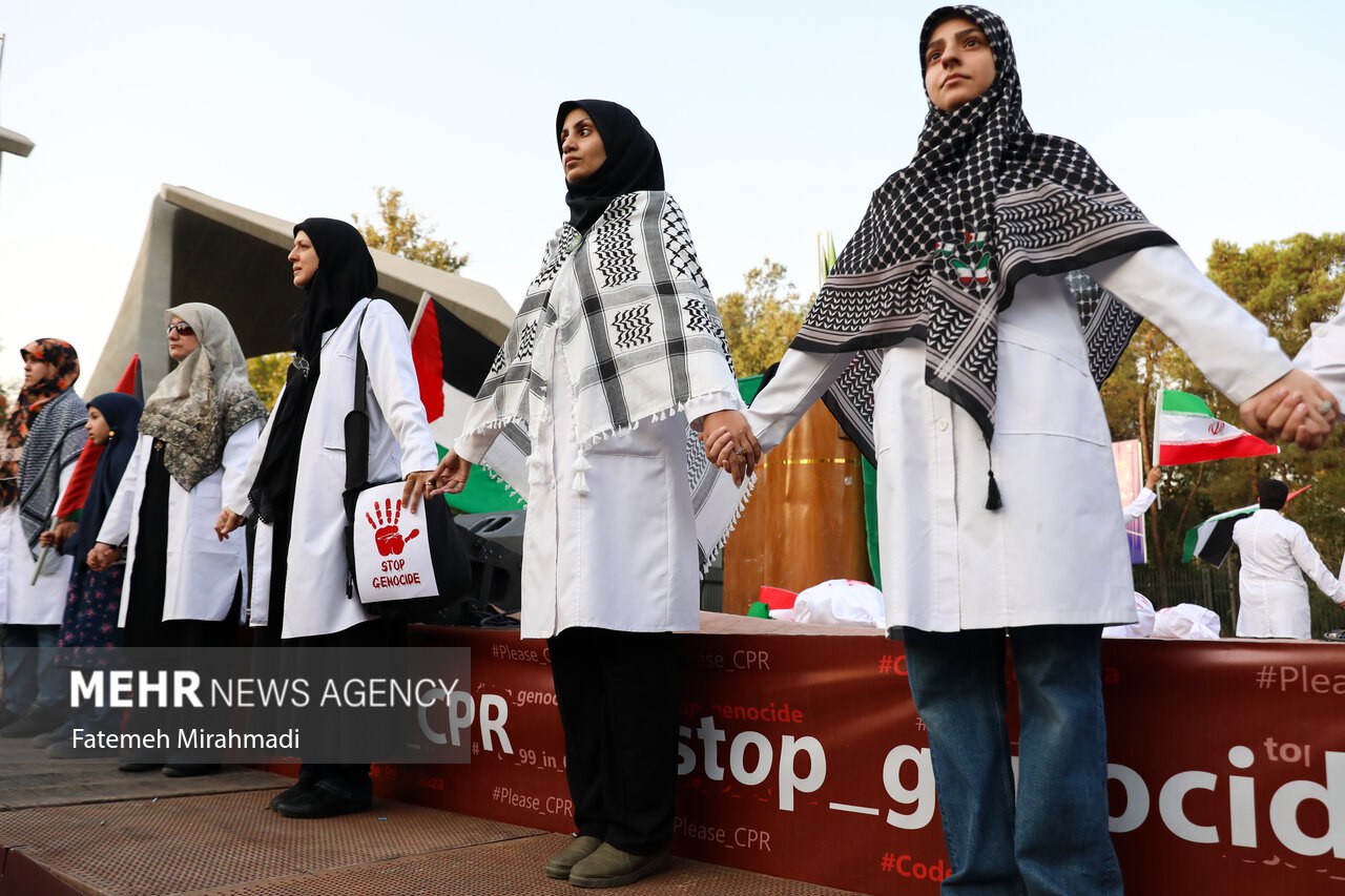 تجمع اعتراضی کادر درمان دانشگاه تهران در محکوم کردن جنایات اسرائیل