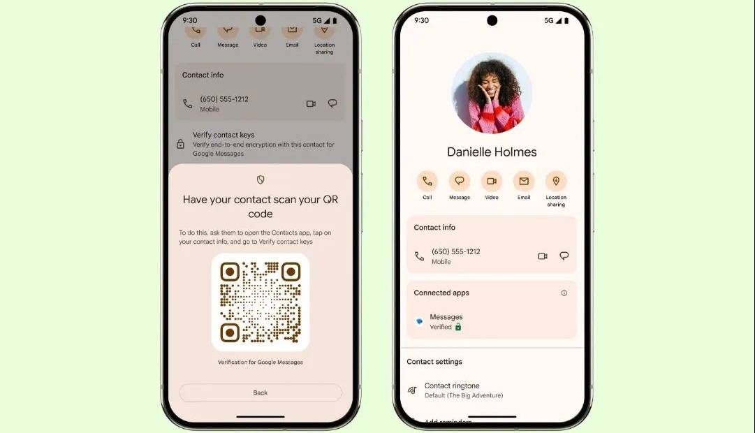 اکنون کاربران بخش جدیدی با عنوان امنیت و حریم خصوصی مشاهده میکنند که شامل گزینهی «تأیید کلیدها برای این مخاطب» (Verify keys for this contact) است. در این قسمت، گوگل توضیح میدهد: «چرا باید کلیدها را تأیید کرد؟ این کار تضمین میکند که فقط شما و مخاطبتان قادر به خواندن پیامهای RCS باشید. چگونه باید کلیدها را تأیید کرد؟ کافی است کد QR نمایش دادهشده روی دستگاه مخاطب را اسکن کنید و سپس از او بخواهید کد QR شما را اسکن کند.با مراجعه به بخش Connected apps در اپلیکیشن گوگل Contacts میتوانید وضعیت تأیید کلیدها را بررسی کنید.»