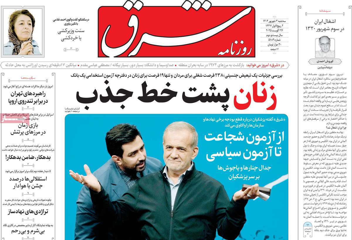 صفحه اول روزنامه شرق سه‌شنبه ۴ شهریور