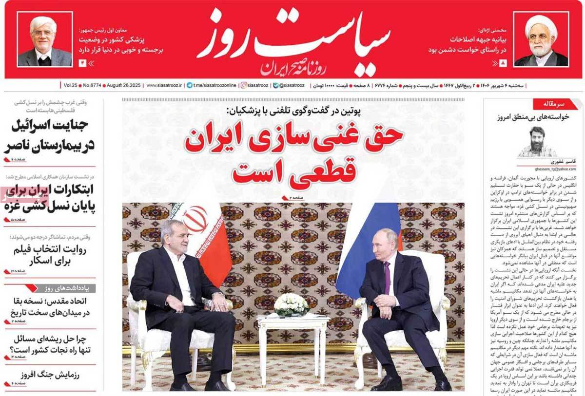 صفحه اول روزنامه سیاست روز سه‌شنبه ۴ شهریور