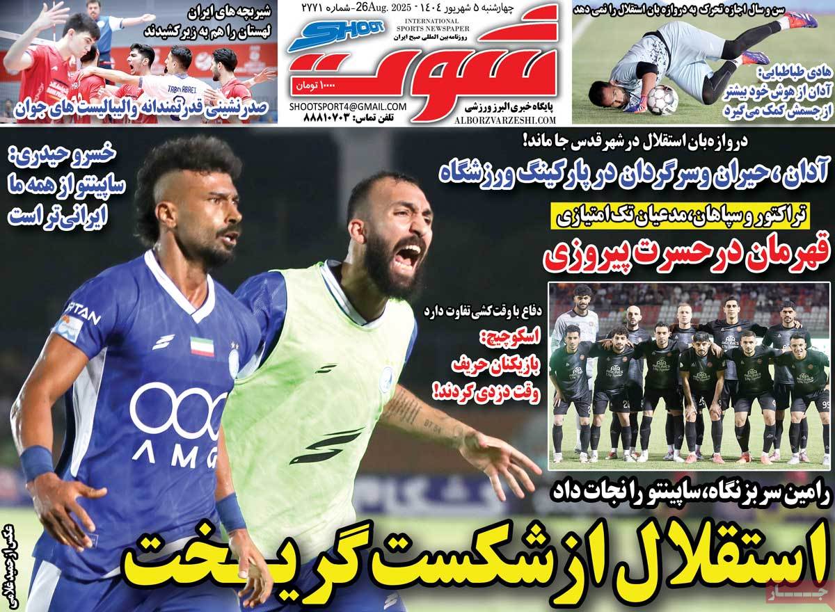 صفحه اول روزنامه شوت چهارشنبه ۵ شهریور