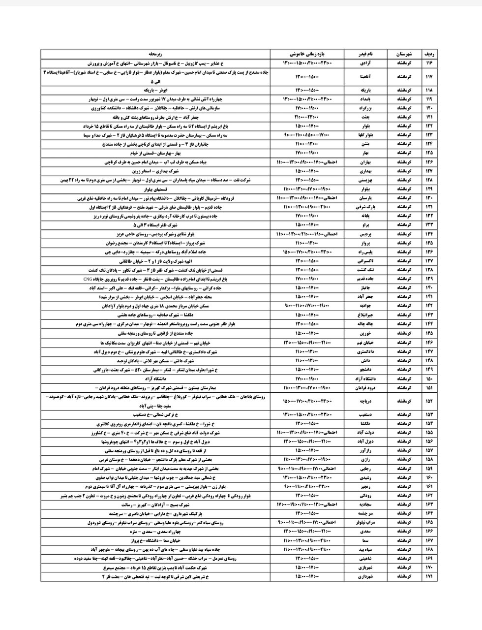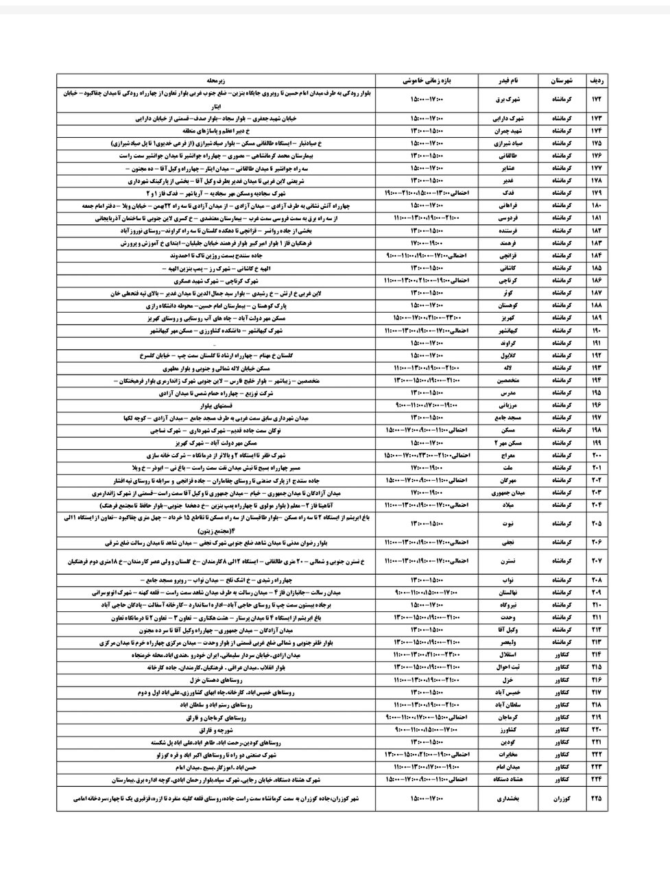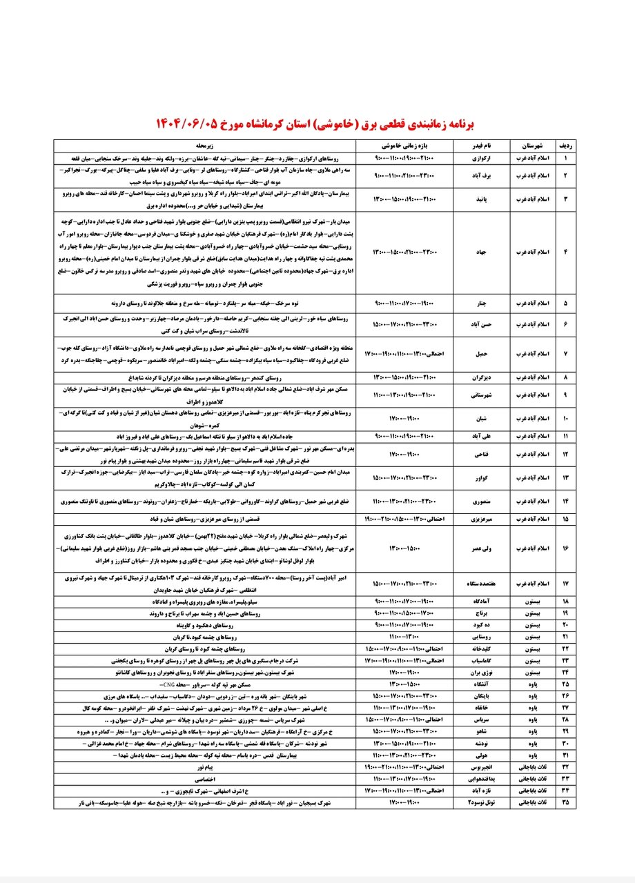 شرکت توزیع برق استان کرمانشاه در جدولی، زمانبندی قطعی برق کرمانشاه در مناطق مختلف استان کرمانشاه را برای امروز _چهارشنبه پنجم شهریور_ اعلام کرد.