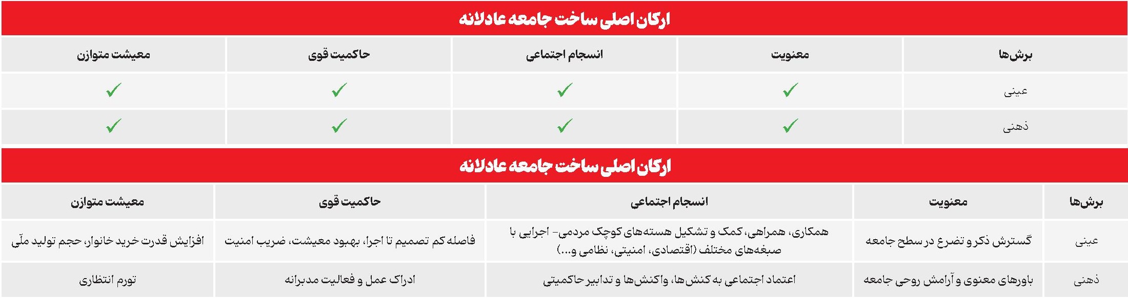 با تحلیل توحیدی - میدانی شرایط جنگ 12 روزه میتوان گفت که اتصال و تقویت کانال «معنویت - انسجام اجتماعی» توانست ضعف یا فقدان وجود مؤثر سایر بازوهای تحقق عدالت اجتماعی را جبران و وجهه سلبی عدالت اجتماعی - مبارزه با طاغوت - را متمایز و متجلی کند. طبیعتاً این نقطه (انسجام اجتماعی) در طول جنگ پنهان در این سالها میرفت که به نقطه ضعف جدی در مسیر عدالتگستری ملّی بدل شود اما شرایط جنگی ملموس و نصرت الهی زمینه تبدیل این سیئه به حسنه را رقم زد و به نقطه کانونی قوت و مقاومت کشور بدل شد؛ اما همچنان نیازمند ترمیم و صیانت است. در کنار عناصر بالا، چهارچوب تحلیلی ما دو وجه عینی - ذهنی نیز دارد. ترکیب این ابعاد با یکدیگر ماتریسی هشتخانهای خواهد ساخت که با آن اولاً میتوان شرایط جامعه را از منظر عدالت اجتماعی تحلیل کرد و ثانیاً بر مبنای هر تحلیل و ارزیابی، مجموعه اقدامات اصلاحی، ترمیمی و حتی ساختی جدید را پیشنهاد کرد، بنابراین ما با هشتخانه متمایز برای تقویت جبهه عدالت اجتماعی مواجهیم که باید برای هریک راهبرد و استراتژی متناسبی را اتخاذ کرد.