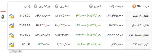 تا لحظه تنظیم این خبر، طلای 18 عیار 8 میلیون و 343 هزار و 500 تومان قیمت دارد و 47 هزار و 100 تومان گران شده است.